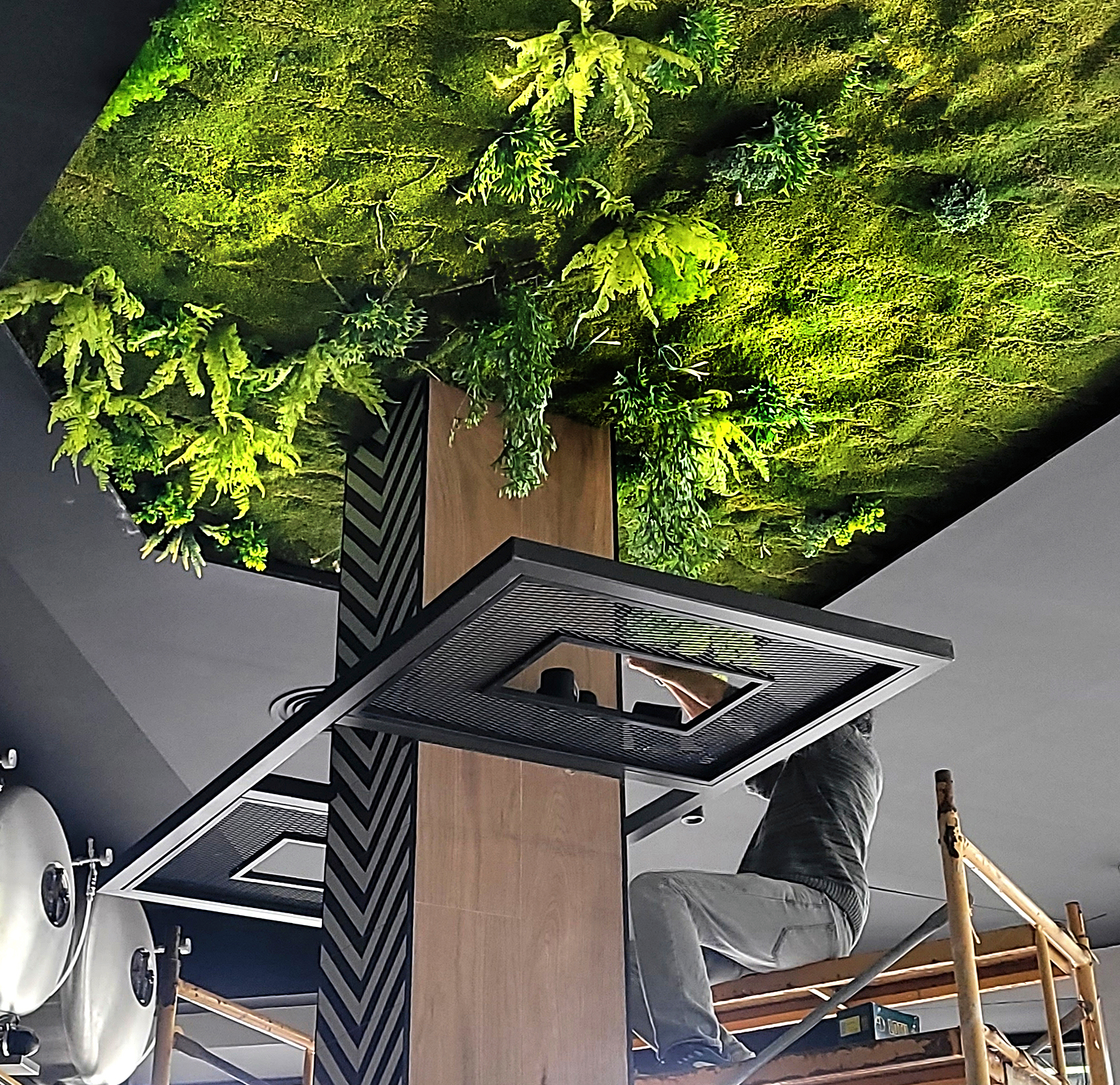 Los Techos de edificios, oficinas, restaurantes… también son susceptibles de ser decorados con nuestro exclusivo musgo Muros Frescos, ya que su nivel de ignifugación está acorde con este tipo de ubicación, aportando una belleza extra allí donde se quiera realzar un techo sin luz y anodino. En este tipo de jardín es necesario una iluminación perimetral conveniente.