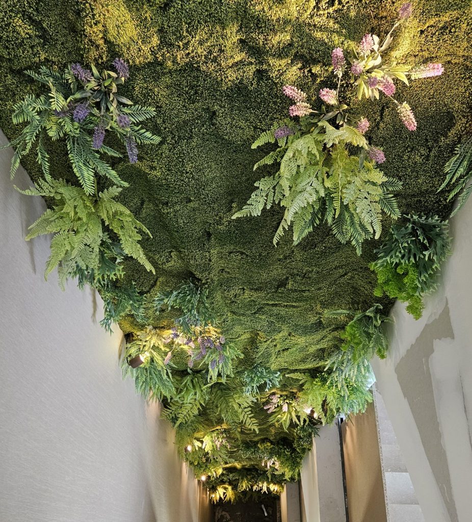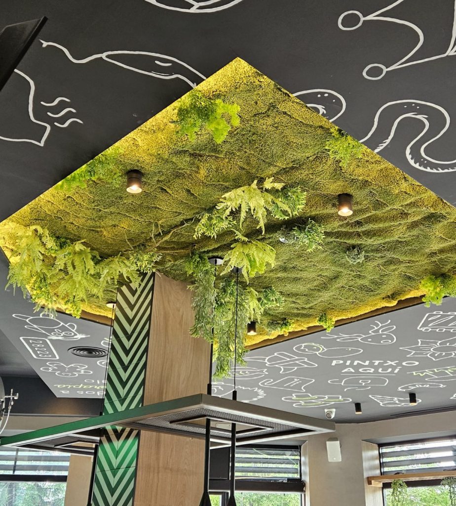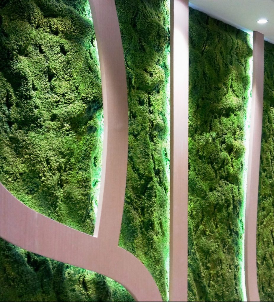Un proyecto muy dinámico ya que nuestro musgo artesanal combinado con las lamas de madera simulan troncos y ramas de árboles.
