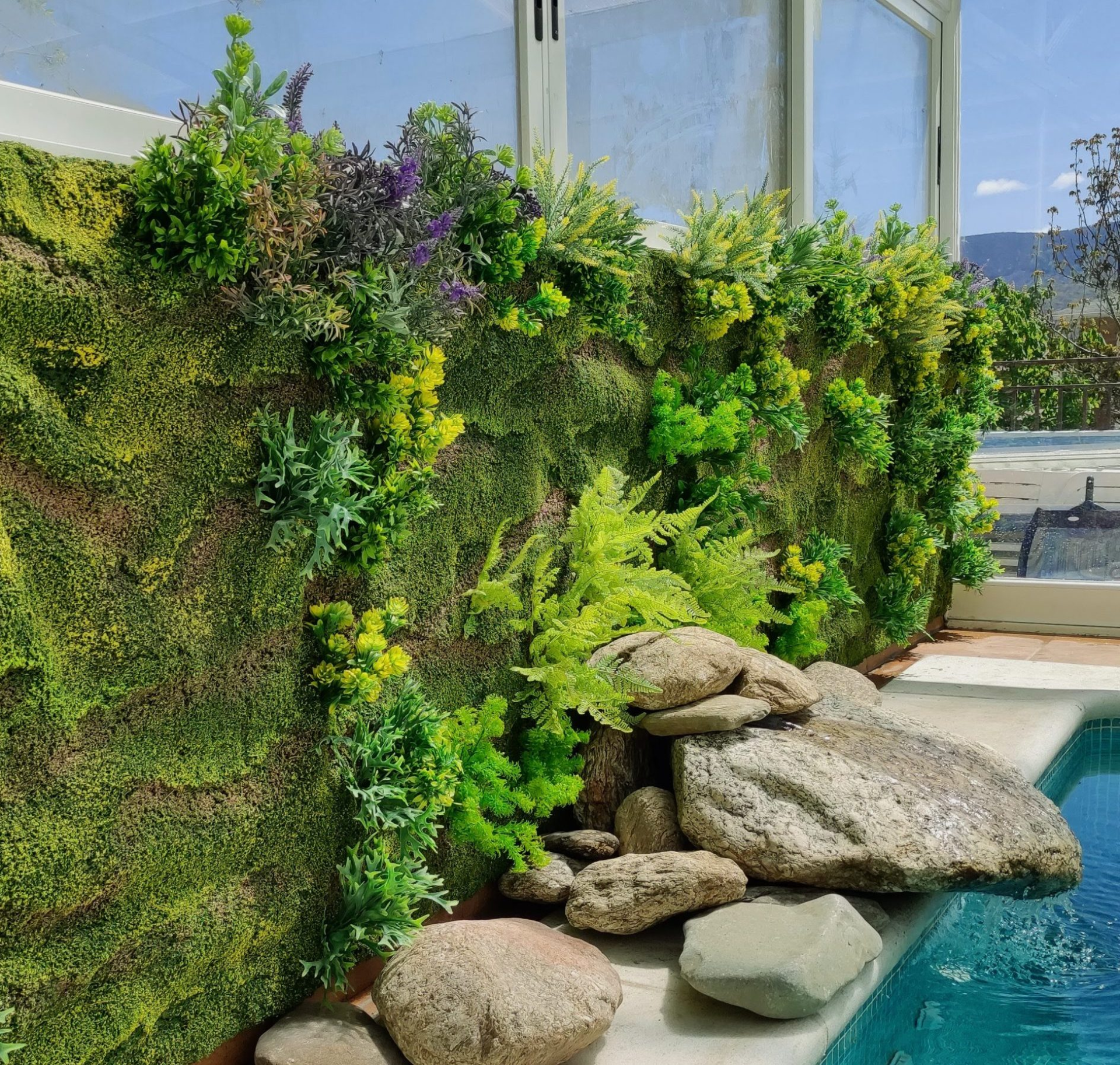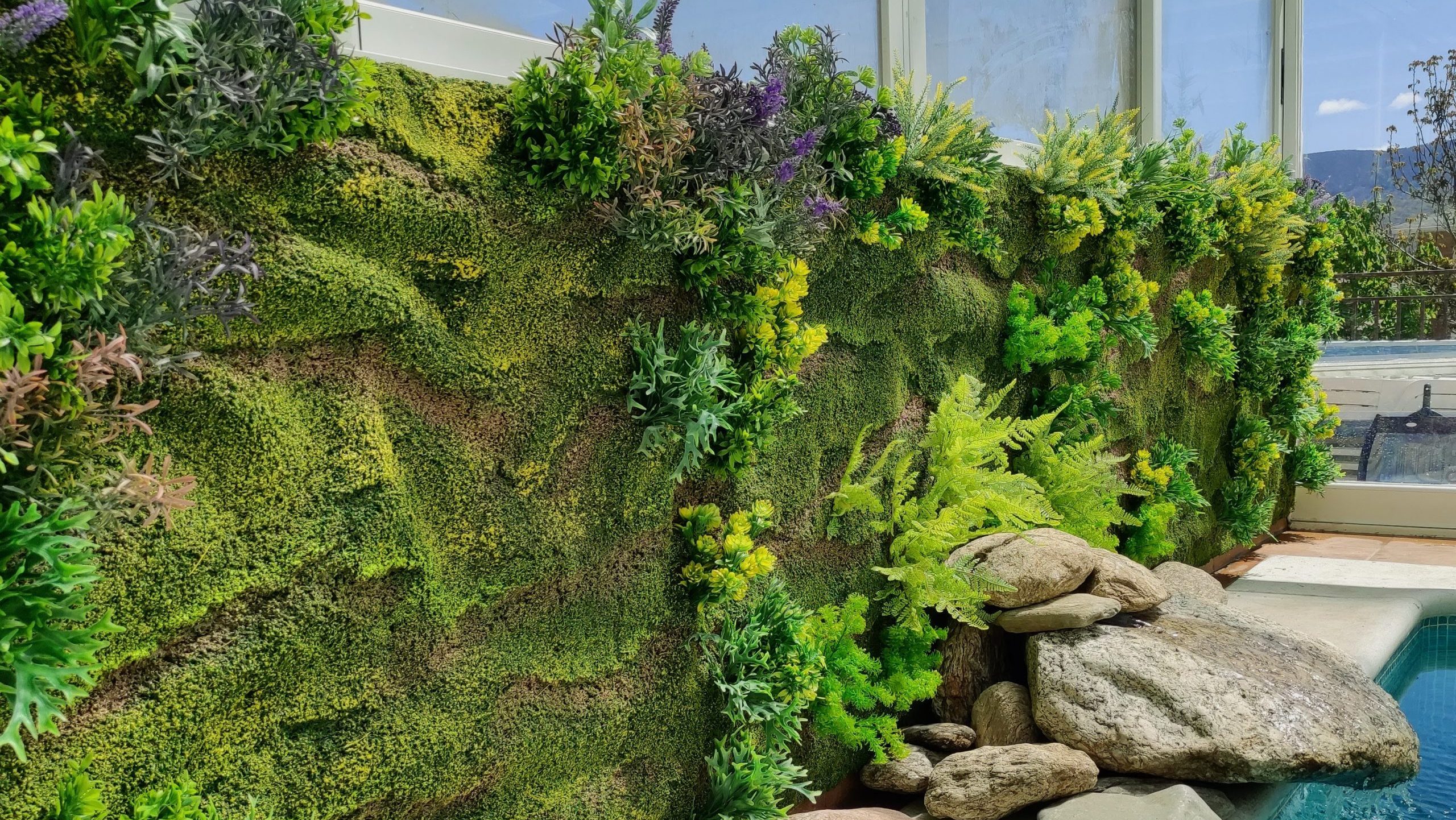«Los jardines verticales sintéticos son una excelente solución para decorar y revestir una pared, ya sea dentro de casa o en el exterior como en este caso, gracias a su tratamiento «anti UV» garantizamos una larga durabilidad«.